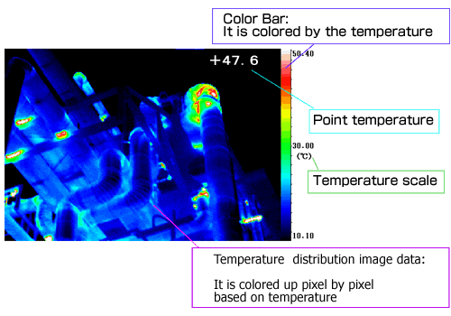 Temperature distribution image data of infrared thermography consists of matrix of pixels (number of detector: for example, 320 horizontal X 240 vertical pixels) as shown in the figure above. Thermal image data can be transferred to PC. Subsequently, the data can be calculated and utilized freely. Thermal image data is colored up pixel by pixel based on temperature.