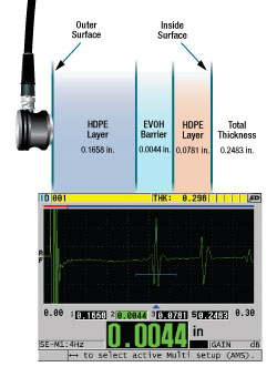 This software option calculates and simultaneously displays thick- ness measurements of up to four individual layers. It also displays total thickness of selected layers. Typical applications include thickness of barrier layers in plastic fuel tanks, bottle preforms, and soft contact lenses.