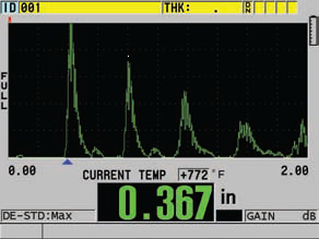 Measurements at elevated temperatures (higher than approximately 50° Celsius or 125° Fahrenheit) represent a special category. First, it is important to note that standard direct contact transducers will be damaged or destroyed by exposure to temperatures higher than this limit. This is due to the varying thermal expansion coefficients of the materials used to construct them, which will cause disbonding at elevated temperatures. Direct contact transducers should never be used on a surface that is too hot to comfortably touch with bare fingers. Thus, high temperature measurements should always be done in Mode 2 or Mode 3 with either a delay line transducer (with an appropriate high temperature delay line) or an immersion transducer.